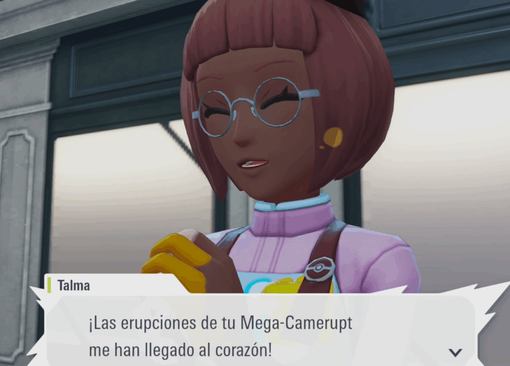 Nos dirá que necesita un poco de inspiración para seguir diseñando lentillas de colores y nos comentará que quizás viendo un Pokémon megaevolucionado le vendría la inspiración por lo que nos pedirá que combatamos contar ella con un Mega-Camerupt.