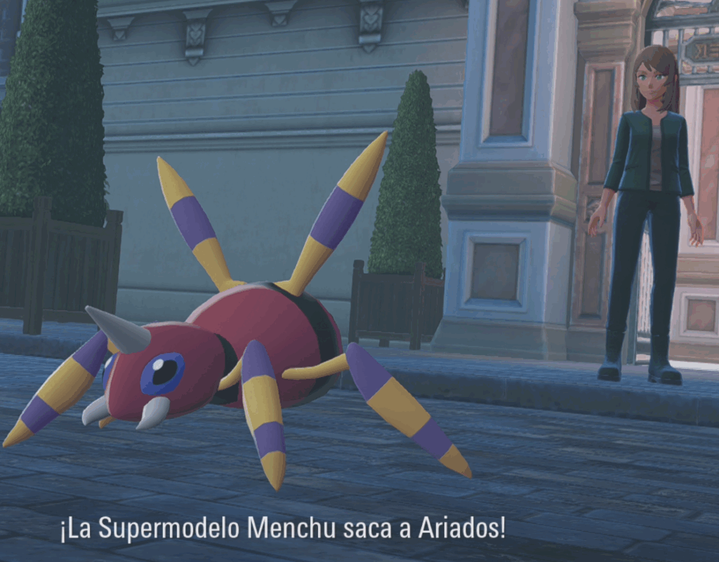Tras aceptar comenzaremos el combate. Tendrá tres Pokémon, el primero será un Ariados nivel 43, un Phantum de nivel 43 y Roselia de nivel 44.