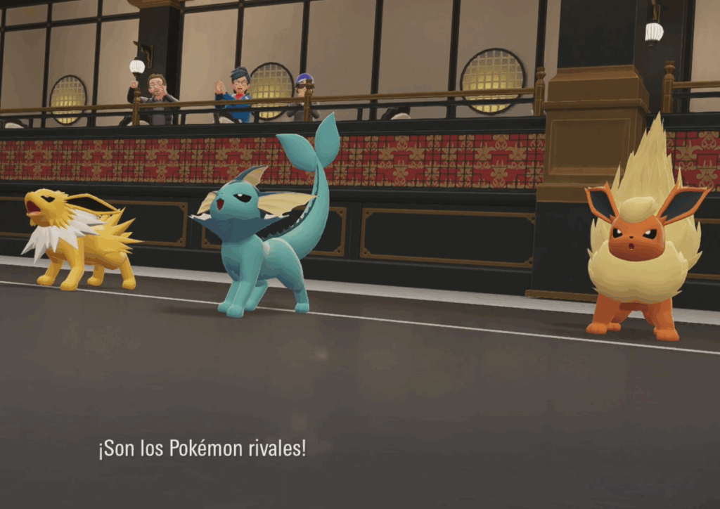 Para el último combate tenemos a Jolteon, Vaporeon y Flareon a nivel 50. Aqui podemos usar Pokémon Planta/Eléctrico para Vaporeon y Tierra para Jolteon y Flareon.